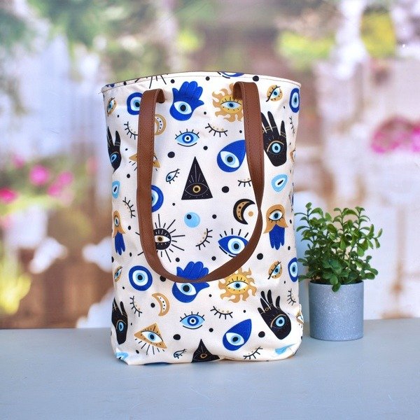 Bolso estampado de cordura con manijas de cuerina en color marrón.